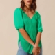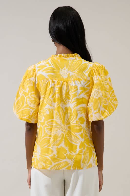 Yellow floral top with button down front and bubble sleeves.