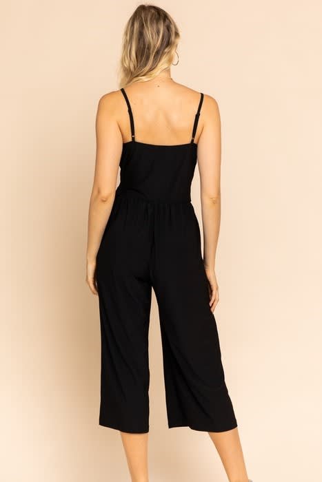 Black cropped jumpsuit with adjustable spaghetti straps.