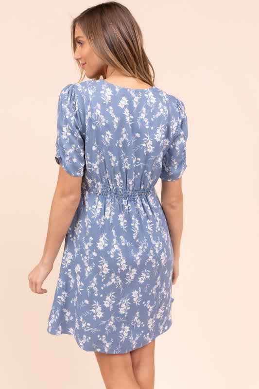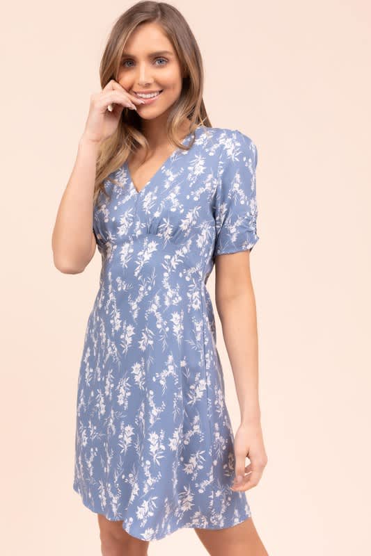 Blue dress with white floral print.
