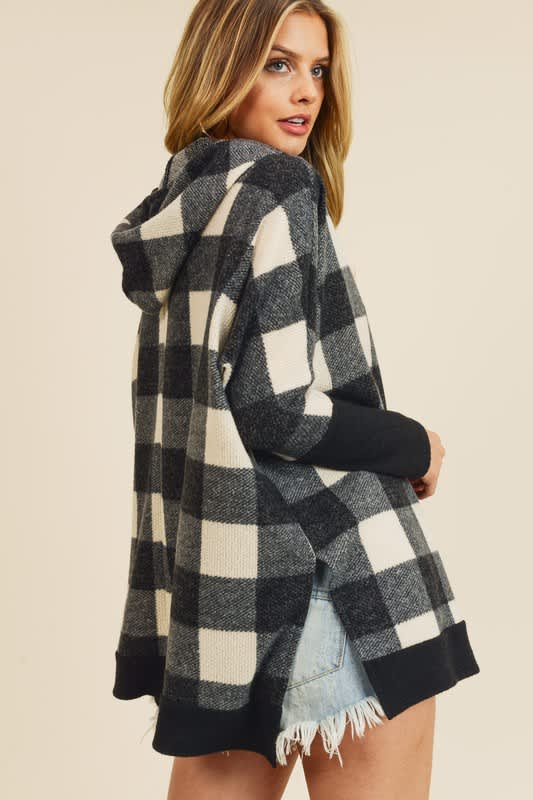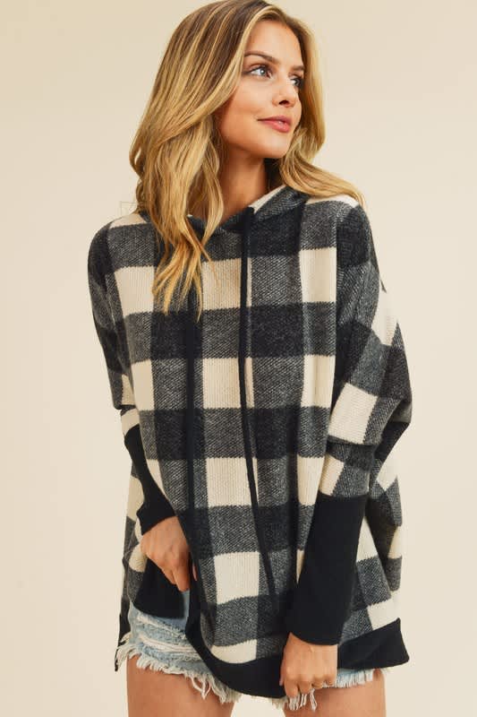 Soft black and white buffalo plaid hooded sweater.