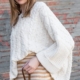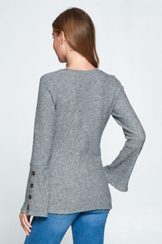 Heather gray sweater with button detailing on the sleeves.