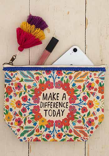 Features mini pom pom trim and stacked pom pom tassel zipper pull. Unlined Sentiment: make a difference today Composition: 100% cotton canvas Dimensions: 9.5in L x 6.5in H, 3.25in W bottom gusset