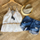 Cream tank with navy paisley contrast back.