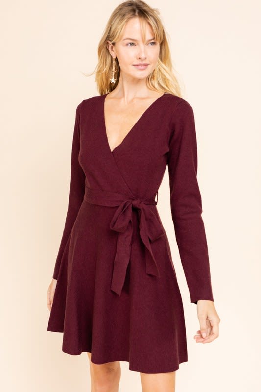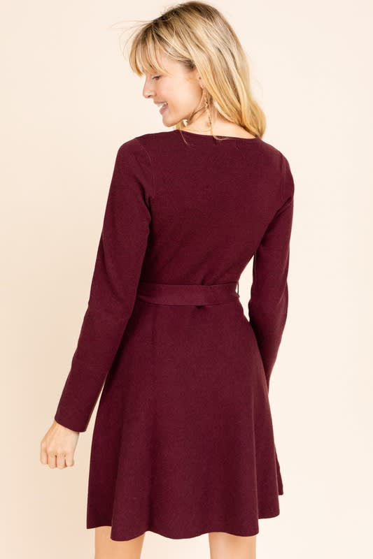 Deep wine surplice dress with self tie belt.