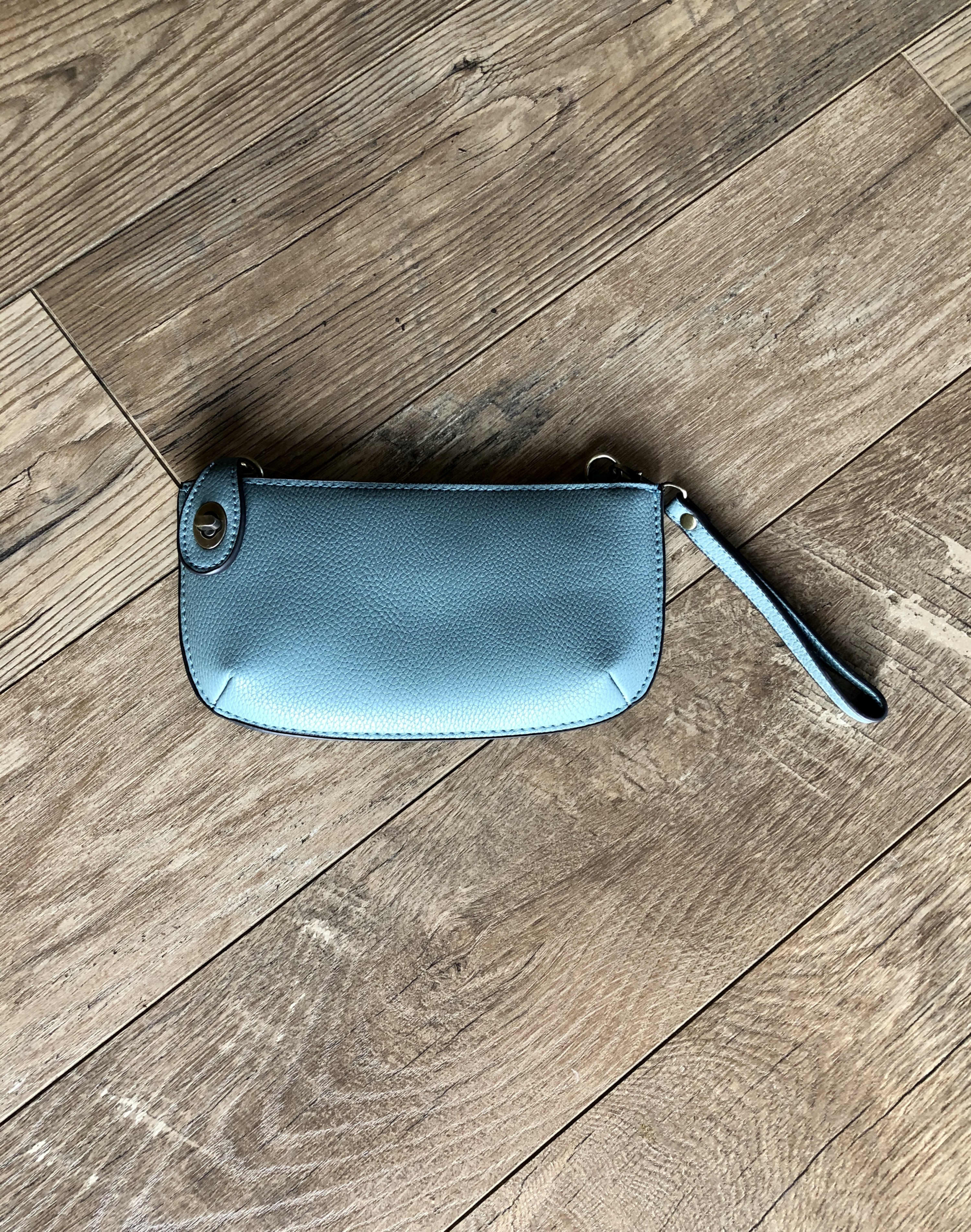 Dusty Blue clutch with removable wristlet and cross-body strap.