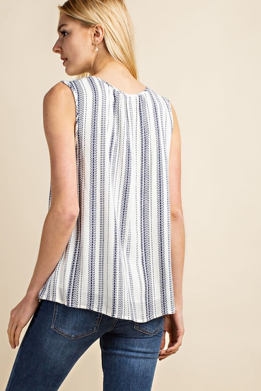 White sleeveless top with blue stripes.