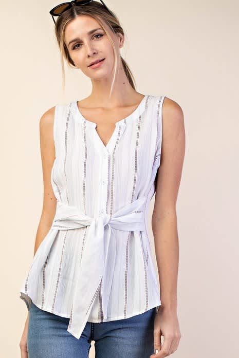 Front tie sleeveless button down top.