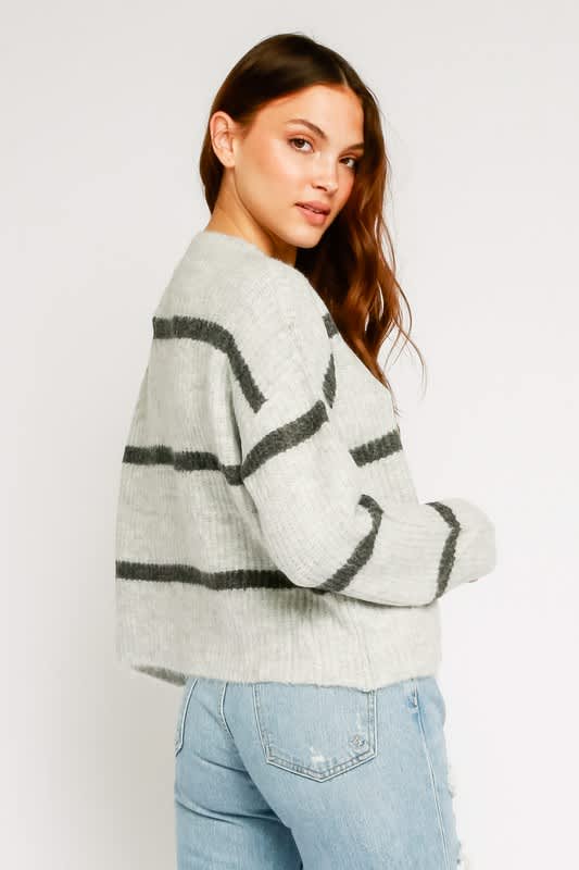 Soft gray striped pullover sweater.