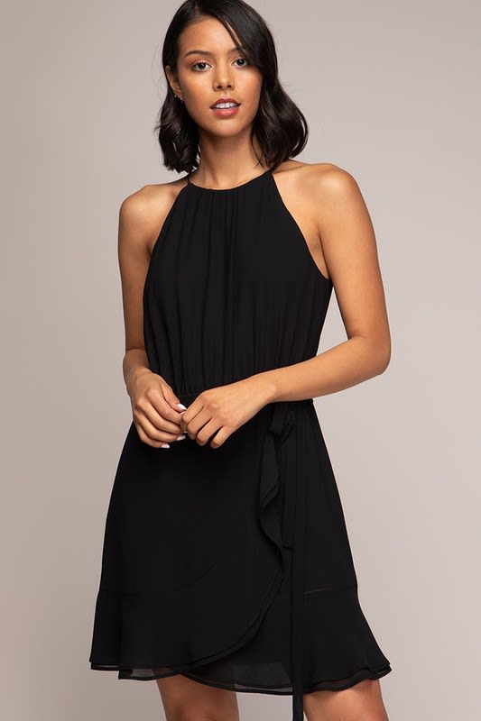 Perfect little black dress with ruffled hem and self tie belt.