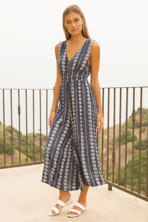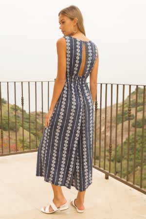 Navy print jumpsuit with cutout sides and peek a boo back.