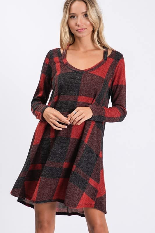 Red and black plaid dress with cutout detail at neckline.