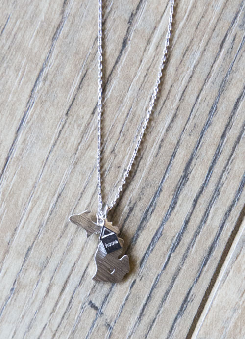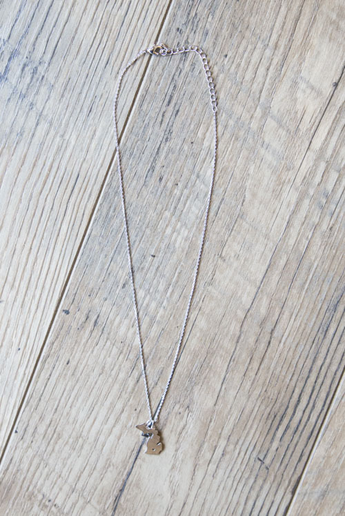 Silver Michigan Necklace Approx. pendant measurement: 3/4 x 3/4 Approx. chain length: 18” (adjustable from 16” to 18”) Material: silver plated brass