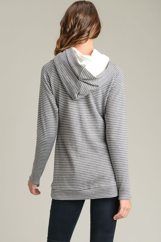 Striped double hoodie with zipper detail.
