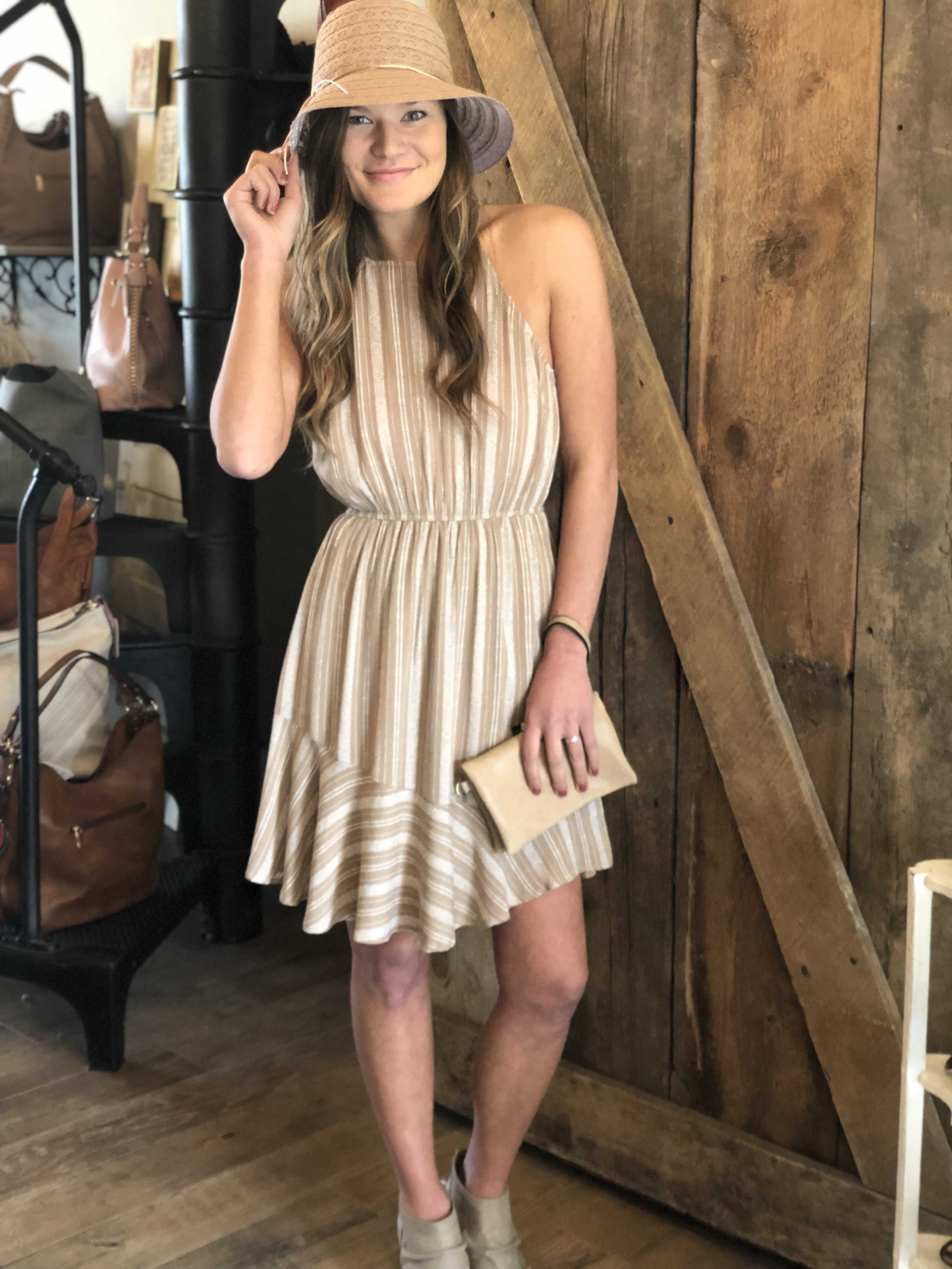 Taupe print dress with bottom ruffle.