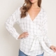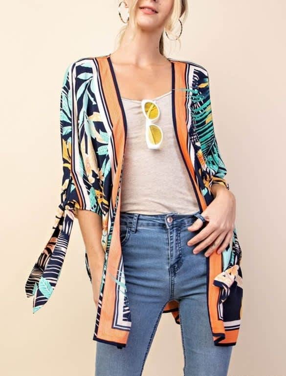 Navy tropical print kimono with tie sleeves.
