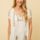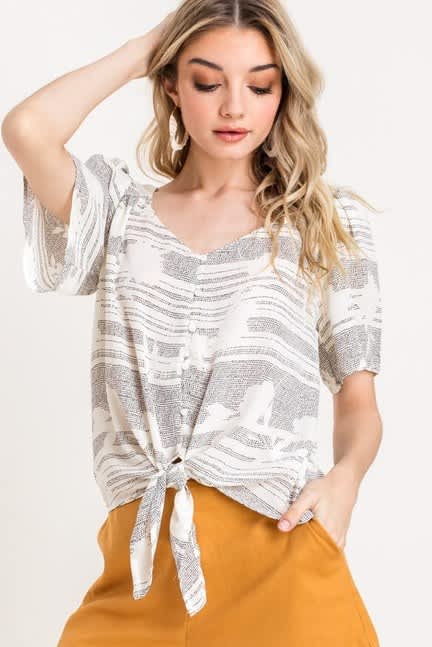 White flowy sleeve top with small black print and tie front.