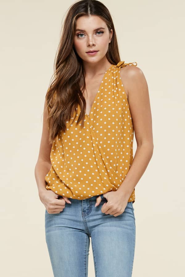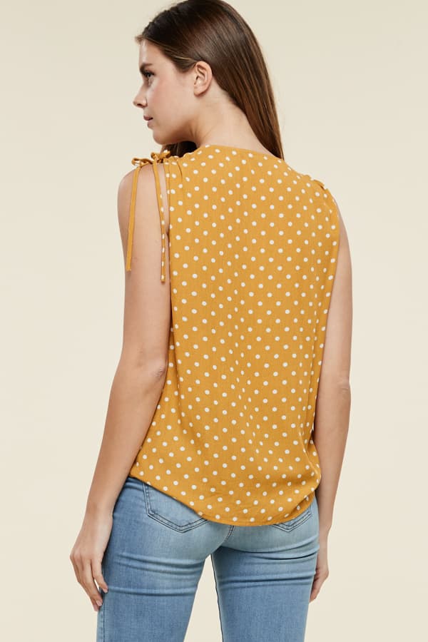 Adorable yellow and white polka dot top with cinched shoulder detail.
